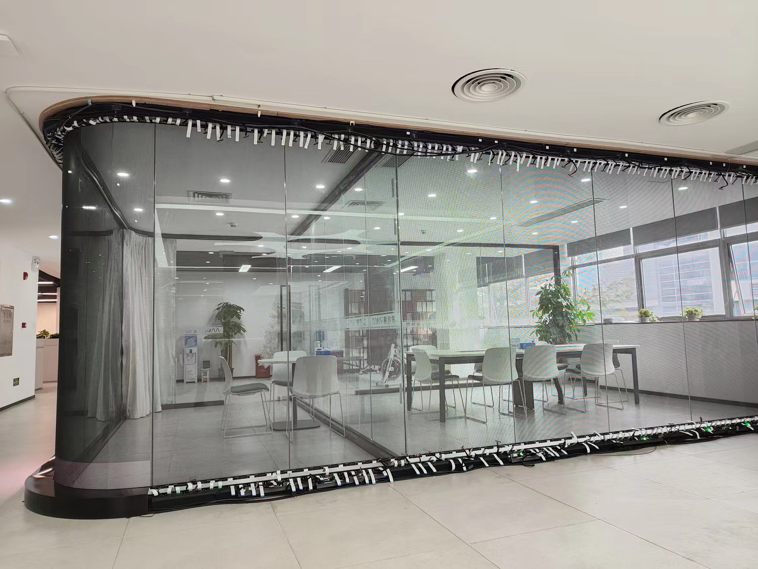 透過型LEDビジョンはブラインドカーテンのようにディスプレイの隙間から奥の景色が見通すことができるのが特徴です。