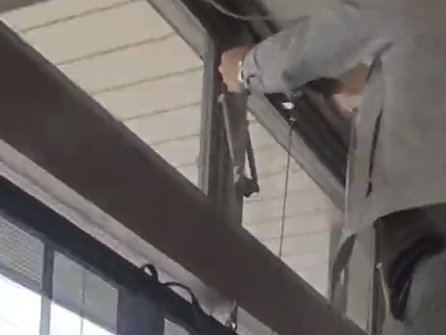 企業社屋玄関の透過型LEDビジョンの設置工事が終了しました。