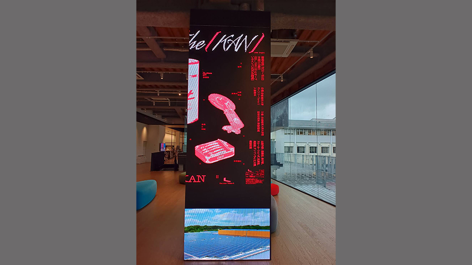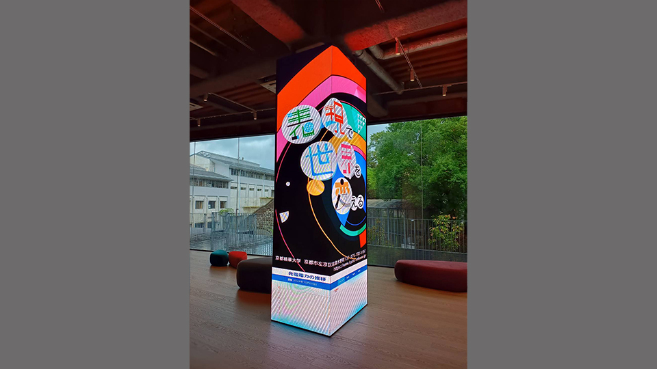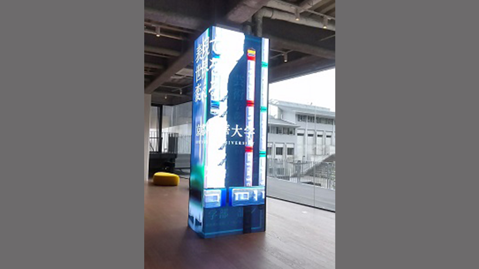 屋内型LEDビジョンは、本事例のような角柱は勿論、円柱や湾曲した箇所にも設置可能であり、